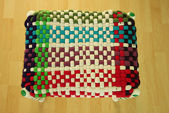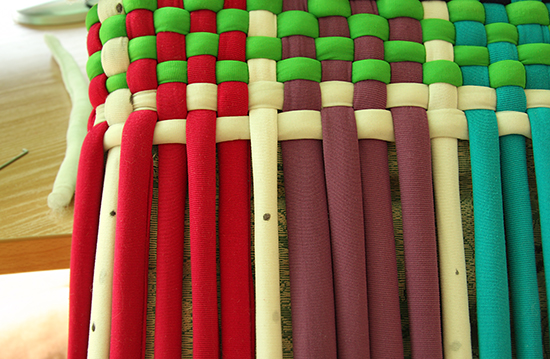 I wanted funky chair. And I made one. Because it wasn't funky enough without big green dots, I made them too. Now I can rest in peace. When sausages were finished was time start the weaving. I was regretting a bit that didn't make sausages a bit longer than the cover, because weaving got very complicated at the end. Nonetheless, I finished and was pleased with the result. I am, I am.